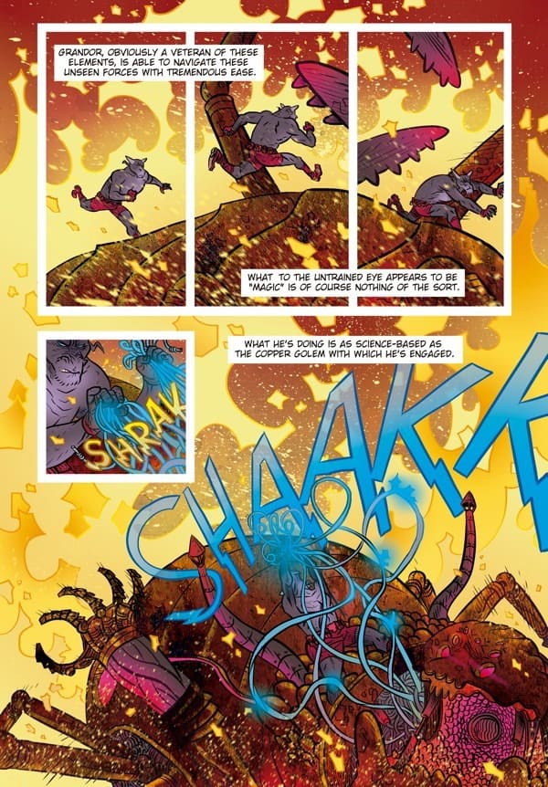 Opening this comic, I was greeted with one of the most metal things to meet my eyes in all of sequential art: A minotaur skydiving into a volcano. There were so many questions that needed to be answered, so much inquisition, I absolutely needed to continue after being utterly gobsmacked by such an opener. What I got was him landing on a robot spider, powered by arcane vacuum tubes…This is the reason I read comic books.