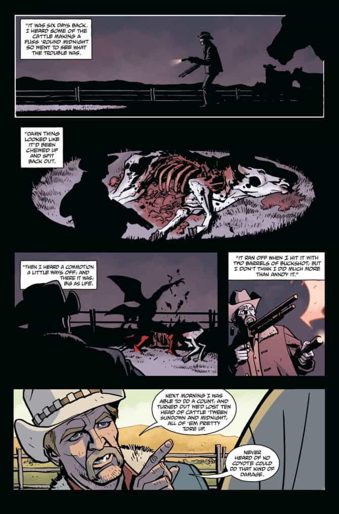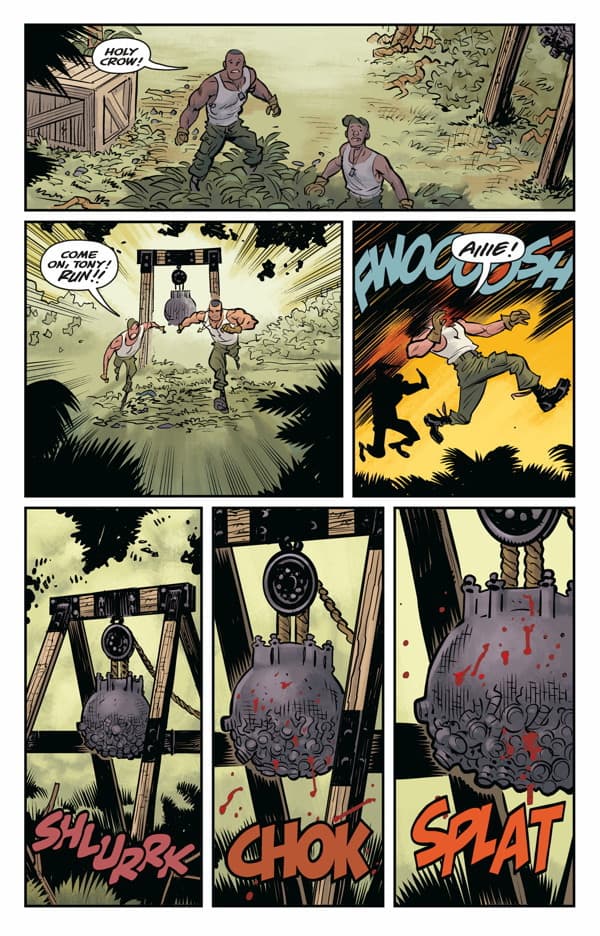 Joe’s ink work is superb. ‘Burning Season’ really shines out thanks to his work. He has a very special style that emerges throughout. Especially the use of heavy dark inks for things like shadows, be they in caves or from trees. And on one particular page where the plot thickens, the inking really adds to making the art pop.