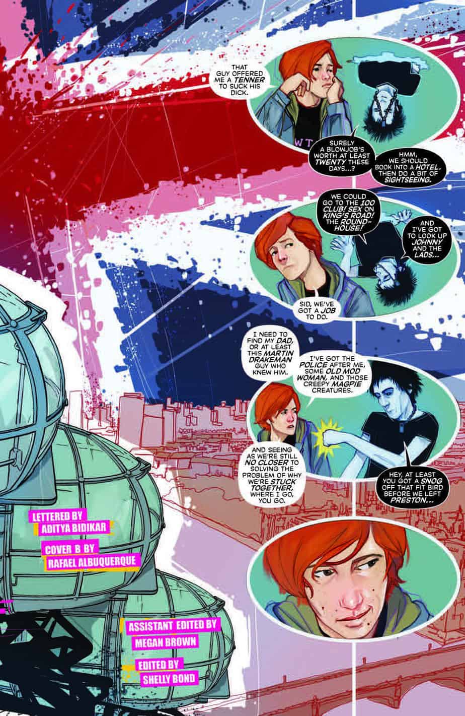 PUNKS NOT DEAD: LONDON CALLING is a five-issue miniseries written by David Barnett (Calling Major Tom) and illustrated by Martin Simmonds (Friendo, Marvel: Jessica Jones, and Quicksilver covers). Featuring a variant cover by fan-favorite Rafael Albuquerque (Batgirl, A Study in Emerald).