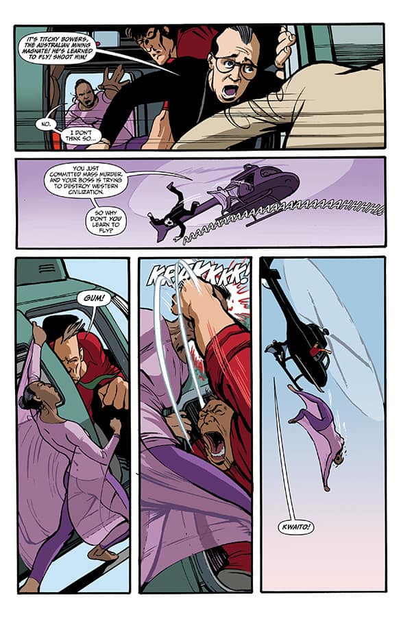 Peter Doherty’s lettering work shines bright as always. It is clear that there’s a lot of heart and commitment to the craft poured into this issue. The same can be said for the previous three books in this series. He approaches lettering each character carefully, whether its Eggsy and Kwaito, or Red Diamond’s henchmen, or civilian figures. Everybody is given a distinct voice thanks to Peter.
