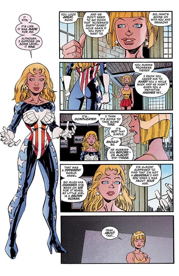 Nikos was a coloring dynamo. It was like the entire known color palette was utilized to bring Erik’s artwork to full-form life. Some of the best pages with his work are the big splashy battle sequences, with lots of characters and energy flashes and explosions galore. Those are the very epitome of superhero action made real, and colored gloriously by Nikos.