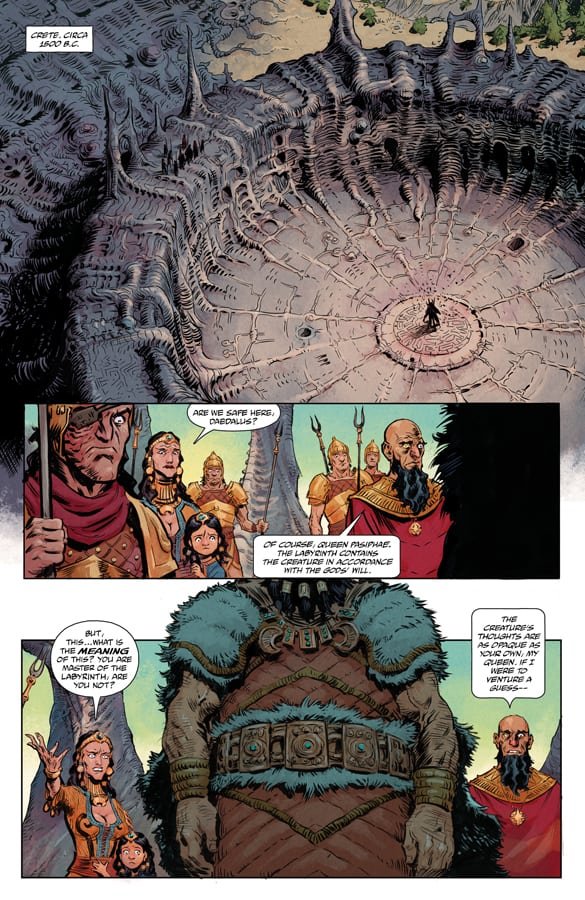 Lukas’ art is mesmerizing. It quite literally draws the eye across the page. There is a boldness to the lines and the designs on all the characters, from Theseus to Ariadne to Minos to the Minotaur. Not to mention the cities of Athens, the island of Crete, and the terrible Labyrinth itself. It is the Labyrinth where he truly went to town, with elaborate lines and crazy visuals to fully encapsulate this place of horrors. All these elements brought to life through the exquisite art of Lukas Ketner.