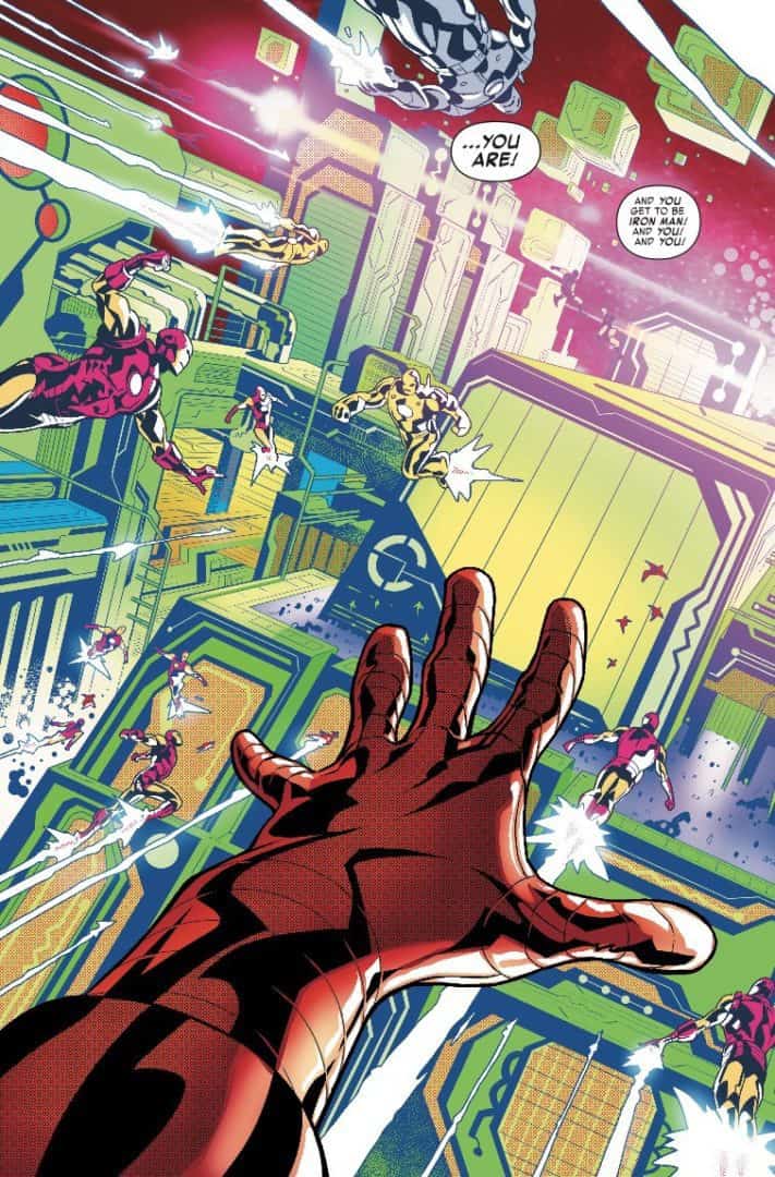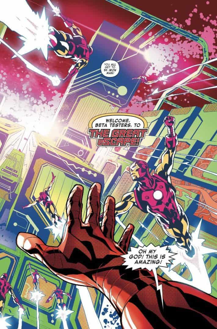 There is a lot of witty banter and dialogue lettered here by Travis Lanham. And some intense plot-moving stuff too. Whether it’s the scenes with Stark and his friends enjoying time together, or the heavy action within eScape with Machine Man, it’s all great stuff. Travis really is at home here with the rest of the Iron Man crew, and this reviewer expects more great things from him.