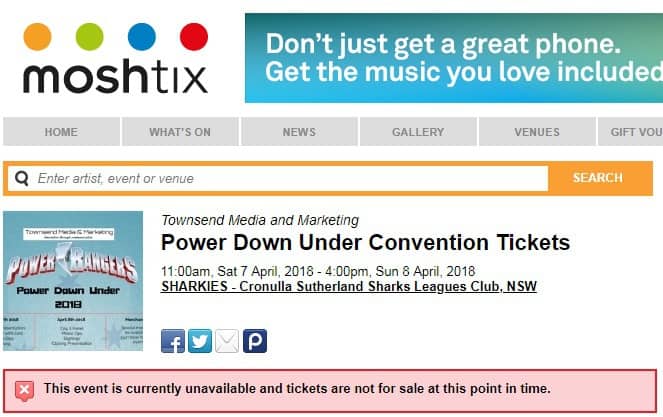 Tickets were available at Moshtix and Eventbrite, both list the weekend of April 7 and 8 for 2018. Moshtix even had a location listed – SHARKIES – Cronulla Sutherland Sharks Leagues Club. However, when I emailed the facility to ask if it was even looked at as a possible venue or possibly even booked, I received a response of “Definitely not here!”