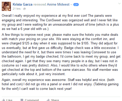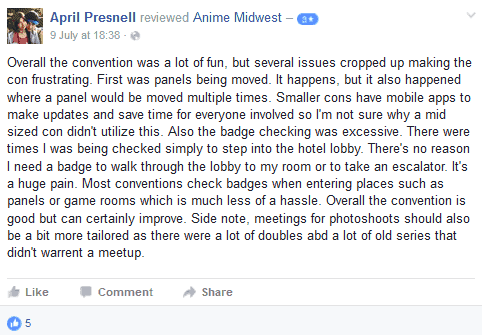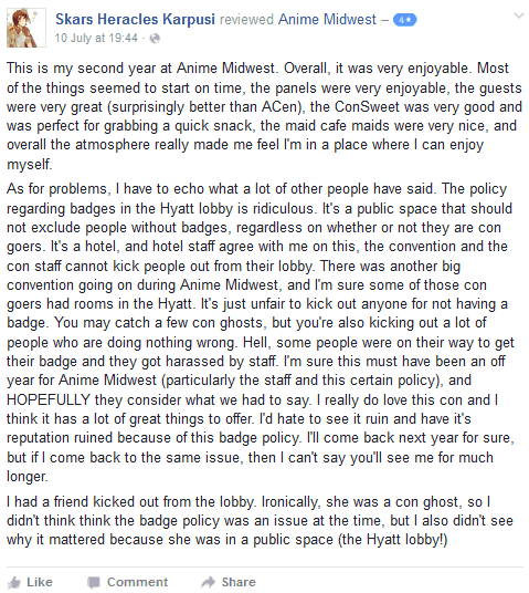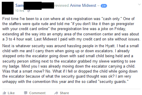 I didn’t have an opportunity to attend the convention, but a lot of people I know did and I started seeing complaints around the web about security harassing them. I decided to investigate the issue and started asking questions. I started making calls, contacting people via Facebook, and even made a few Facebook posts asking people to contact me if they were harassed by Anime Midwest security.