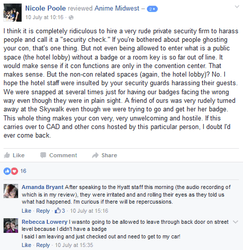 I have reports of hotel patrons being repeatedly asked by security to produce their badges for Anime Midwest. It would be understandable if the hotel patrons were trying to enter a room reserved for an Anime Midwest event, or even if they were going down a hallway where all the rooms led to an Anime Midwest event, but that wasn’t always the case.