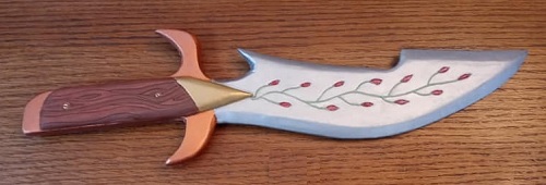 This ornate dagger has a rosewood grip, rose-colored copper fittings, and is decorated with vines and red rose buds on its wickedly curved blade. The dagger is exceedingly sharp and can even pierce platemail armor. The dagger will always hold a keen edge no matter how much abuse the wielder puts it through.