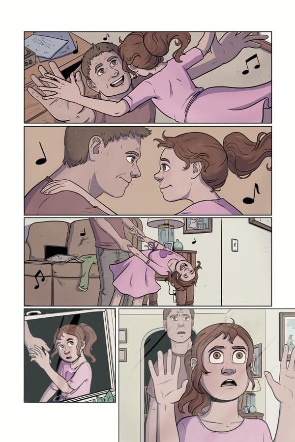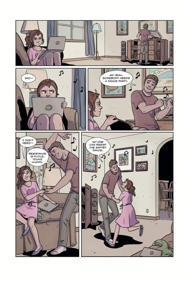 Cassie: We talked about it and there’s this overarching, big story with the aliens and everything. But the heart of the story is the small moments. That was what I really wanted to draw was those small moments. The emotional significance of Cleo and her dad, and the alien posing as her dad, the relationships.