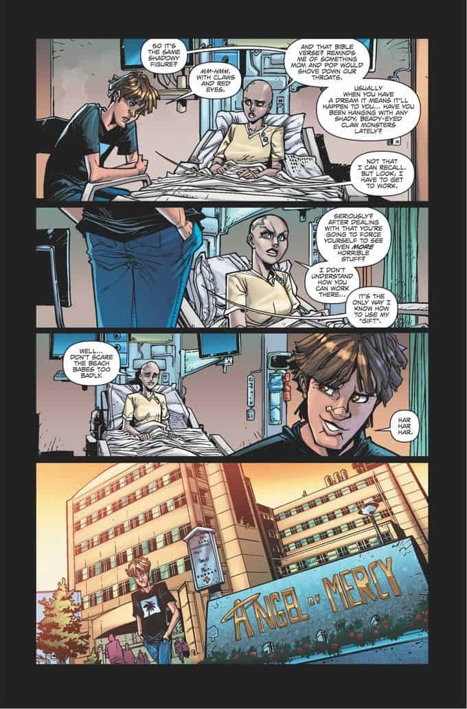 I knew I wanted to incorporate humor in Road Trip to Hell because there’s a lot of doom and gloom. Maccagni’s art turned out to be the perfect blend of both, with his characters’ cartoony expressions really hitting home with the emotion on the panel and his action scenes really packing a punch (both literally and figuratively in some cases). Pereyra’s colors perfectly complimented Maccagni’s art, making every scene pop; he got exactly what I was going for with some muted colors for the hospital and more vibrant colors for the action scenes. And I’ve worked with Birch on numerous projects before, so I knew we already worked well together. Plus he always does a great job on everything he letters (he was nominated for a Ringo Award because of it).