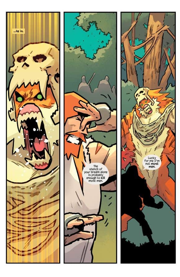 Another hilariously written issue with tons of action-filled panels of pure slugfest brutality, served up once more by writer Justin Jordan and artist Juan Gedeon. The action does not stop from the first page until the very last one and the final panel only spells more impending doom for this rag-tag group of wandering fantasy-style warriors on a secret mission. While I immensely enjoyed the backstory and the non-stop slaughtering, a few of the jokes felt a bit flat and I felt that there was no way our heroes wouldn’t prevail by the end. The cliffhanger is setting up something big to come and the overall plot of the epic journey is still the main focus. I can’t wait to see what comes next, as Justin Jordan has told me where Strayer the series is hoping to lead in the future with lots of twists to come. More with Justin Jordan in PopCultHQ’s upcoming exclusive interview with the AfterShock Comics writer… stay tuned.