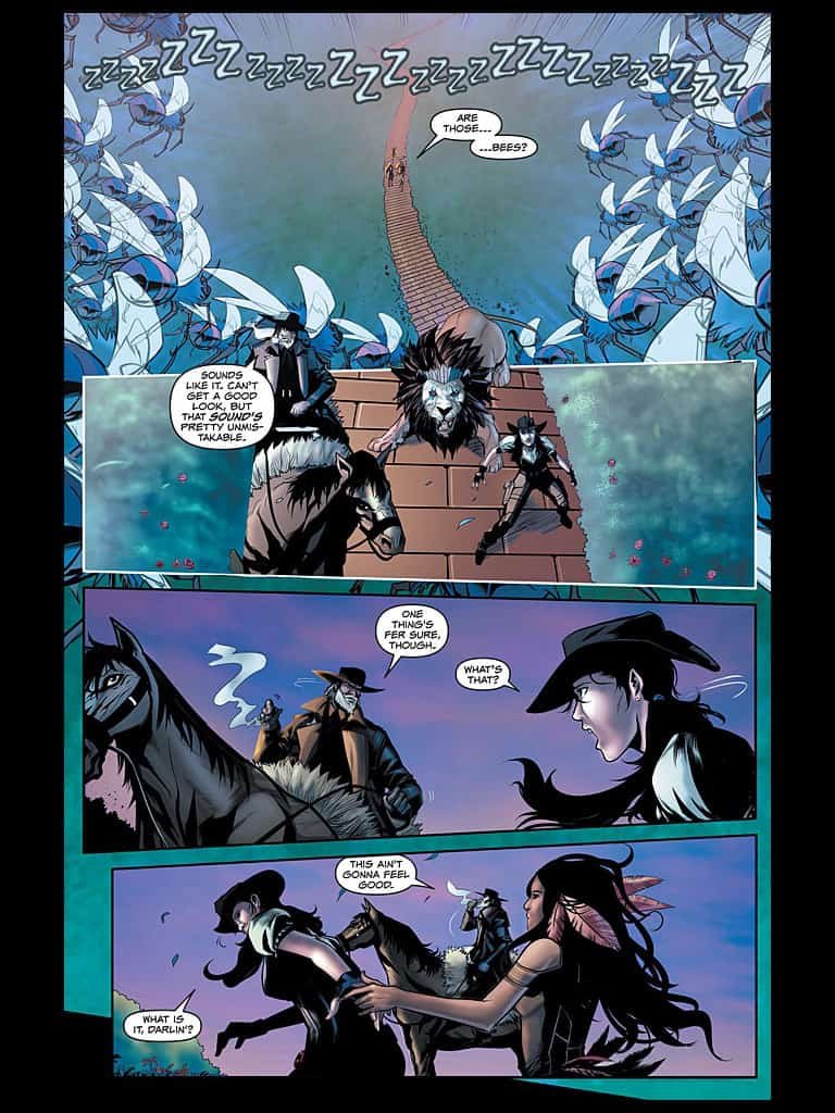 PopCultHQ Review: The Legend of Oz, from that once upon a time tale from over the rainbow, meets the Wicked West in Big Dog Ink and Aspen Comics hit book. Dorothy and her friends must fight against a deadly swarm of bees who are set to stop them in their tracks from getting to the Emerald City, but that’s not the only obstacle in the way. Who is going to sacrifice themselves to help Dorthy and the others to continue on the yellow brick roads path? In this next issue of Legend Of OZ: The Wicked West, the many strange creatures of this land still seem unique and wonderful to Dorthy, but she needs to find home. Too bad the Wicked Witch has other plans for the gun-slinger with her ruby-handled revolvers.