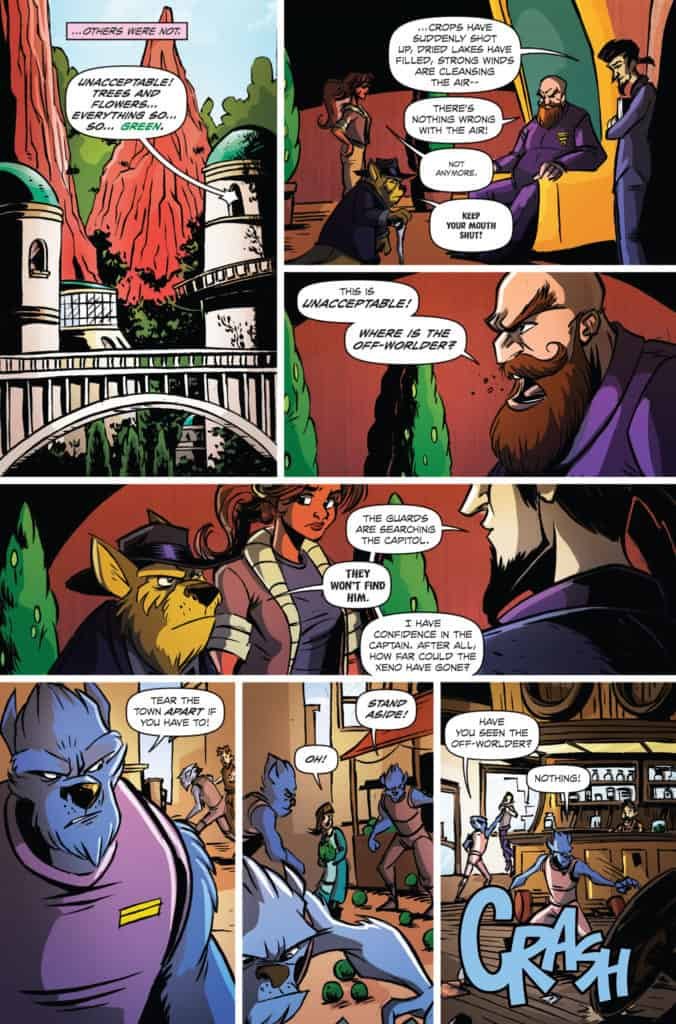 Visually, AWAKE just pops with its illustrations, color choices, and panel layout. Artist Brian Hess continues to produce such vivid imagery, and a sharp look for the series. Characters in AWAKE like Gurk, Regn, Picar, Operi, and Bashi all have a look that would translate easily and beautifully to an animated series. There were times where I saw Gurk in a panel and it reminded me of the look/feel of Batman: The Animated Series, which is pretty dope! Hess has remarkably depicted the characters in such a way to make them instantly recognizable. If AWAKE were to take a year or two off, you could pick right up where you left off and immediately recall things from each individual’s past. Artistically, Brian is truly adept at creating an all-ages series without the typical kiddie feel. This isn’t DC Super Hero Girls where your target audience is young girls within 4-5 years of each and that’s all. The look, feel, attention to detail, and air about the series can be appreciated by comic book fans regardless of age.