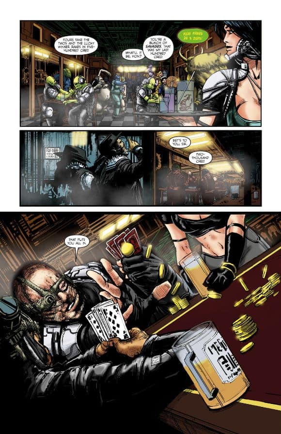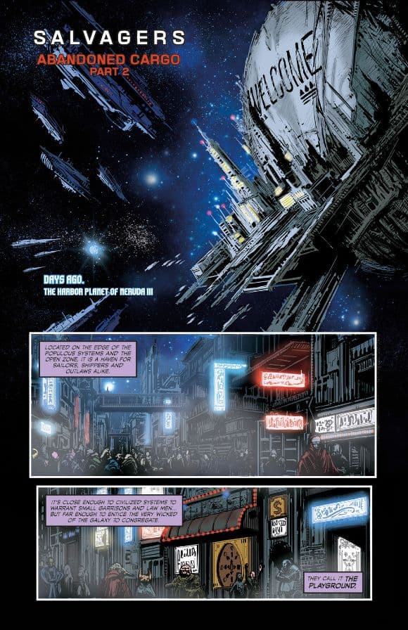 In issue #2 the story continues as we are taken back in time to see how the Salvagers’ resident trouble-maker got mixed up with the treacherous Dorak crime family on The Playground. The Playground, is the hub of the planet’s crime element. A system close enough to garner law enforcement, but still plenty isolated enough in the depths of space to attract all the scum of the Galaxy to its dense population.