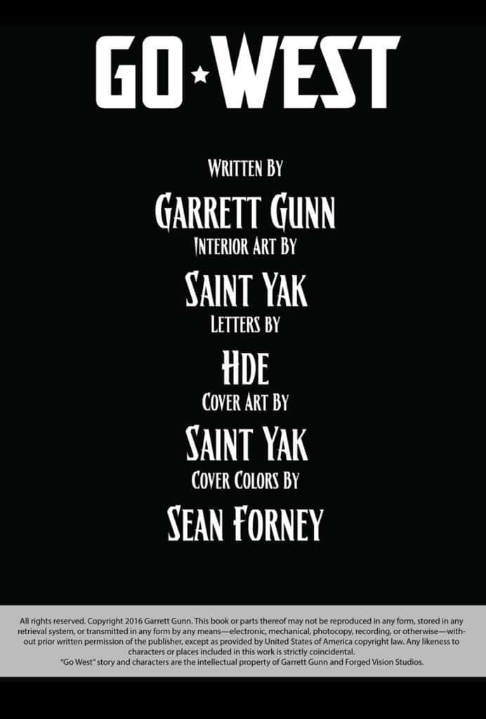Saint Yak has created such powerful imagery in GO WEST and has essentially doubled this book’s value on top of Gunn’s fascinating (and quite possibly prophetic) saga. After reading a mere two issues, you get the sense that Garrett Gunn and The Saint Yak are headed for greatness. This very well could be the series that catapults their careers, individually and collectively. Alterna Comics has struck gold in GO WEST. It’s the perfect ensemble of creators; a writer with a phenomenal narrative and a gift in delivery, a well-rounded, multi-talented artist with a firm grasp of capturing the essence of every scene, and lettering from a pro who notably compliments the story. I highly recommend GO WEST, and to the creators…just like young Anakin Skywalker…