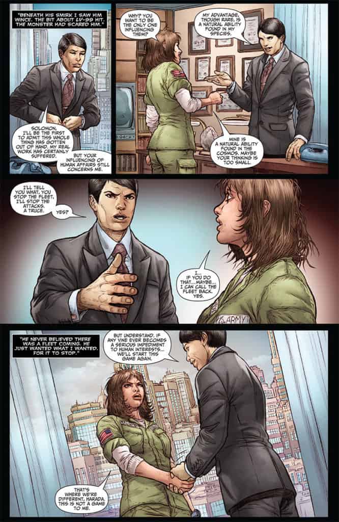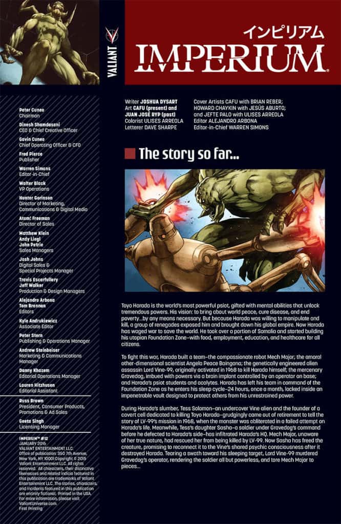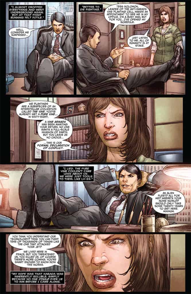 Toyo Harada’s utopian ambition has been shaken to the depths by a decades-old enemy. Since the day Harada began accruing power, the undercover agents of the Vine’s alien empire have watched…and waited. Years later, as Harada strives to reshape the global economy, establish governments friendly to his goals, and gift the ability of space travel to all humankind, the Vine want him put in check – permanently. Now, with saboteurs riddling his organization and the alien assassin called LV-99 slavering to snap his master’s neck…are the Vine about to succeed?