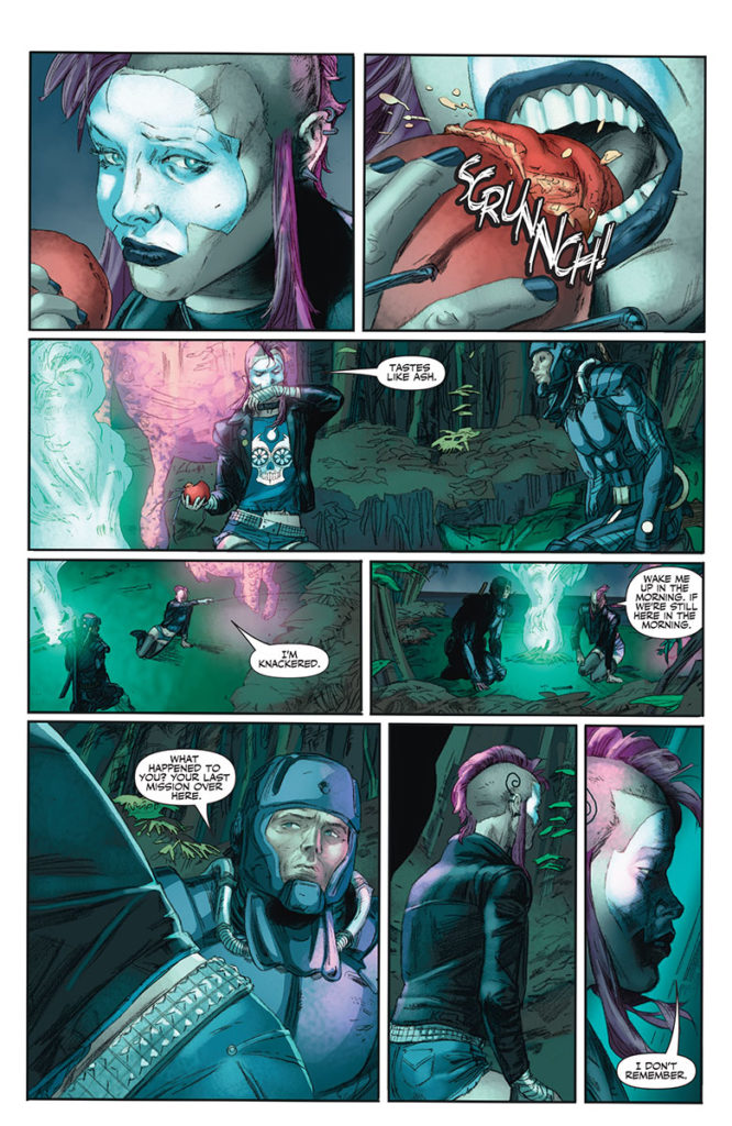 Their path is blocked when they come across an indigenous alien flora with telepathic abilities. Ninjak looks to his companion and asks if this is an occurrence she has experienced in her prior visit. Yet Mambo appears mesmerized and is, in fact, recalling the unnerving visit she previously made. She recalls a flashback to a mysterious, brooding individual named Magpie. Their confrontation resonates within Punk Mambo and the memories are crystal clear.