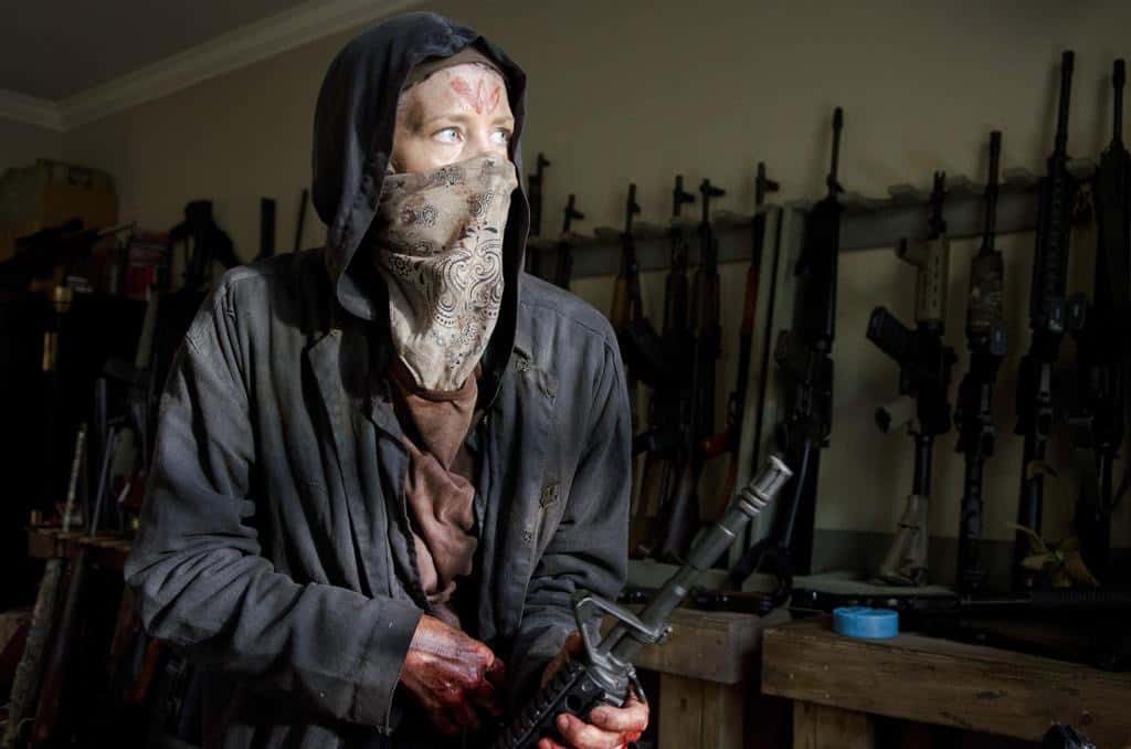 Morgan in my eyes is now a liability not wanting to kill. This was always a mistake and downfall for Rick in the earlier seasons which almost always came back to bite him in the ass later. Just like he did with Rick, Morgan now has issues with how violent Carol is being. While Morgan is playing with his big stick making it spin and slapping people around, here comes Carol with just a deadly stab or a shot to the head. Carol is getting what needs to get done, done and this causes a brief confrontation with Morgan, but Carol doesn’t have time for that. Carol has gone into commando guerrilla warfare dressed as one of the attackers! Her mission is to save the armory and keep the enemy away.