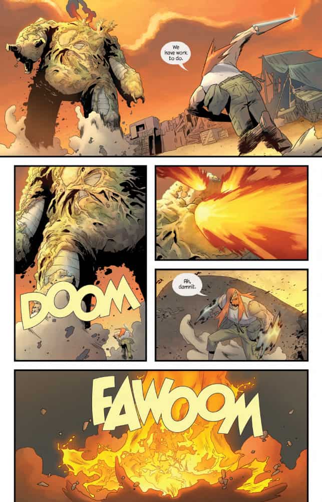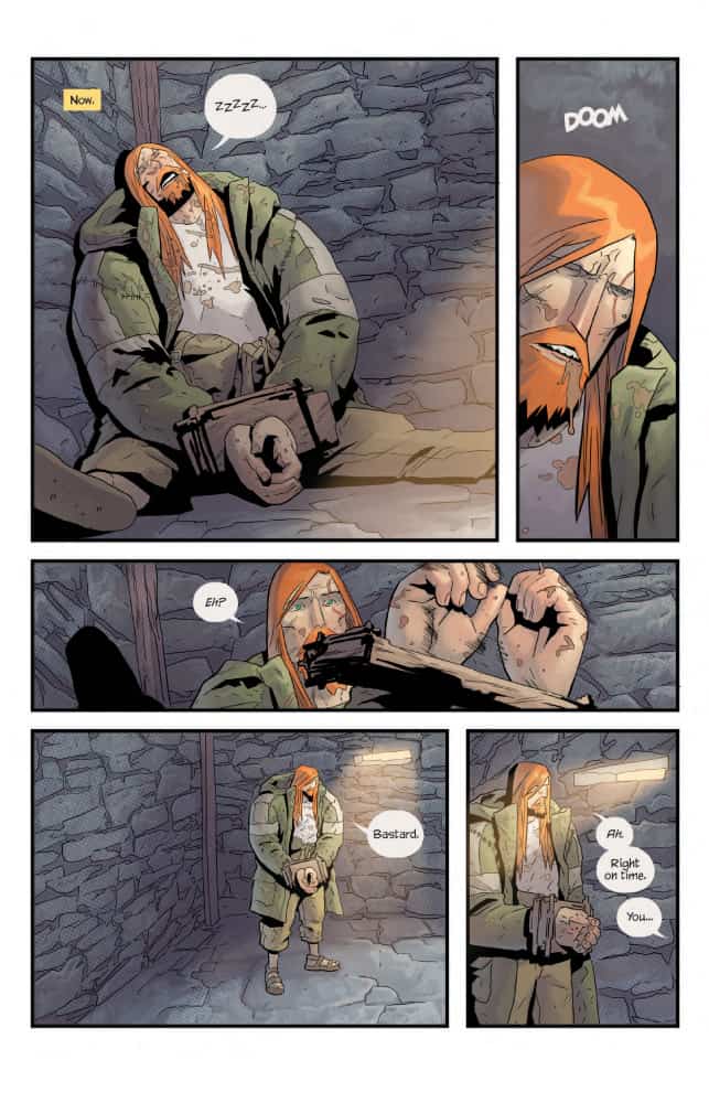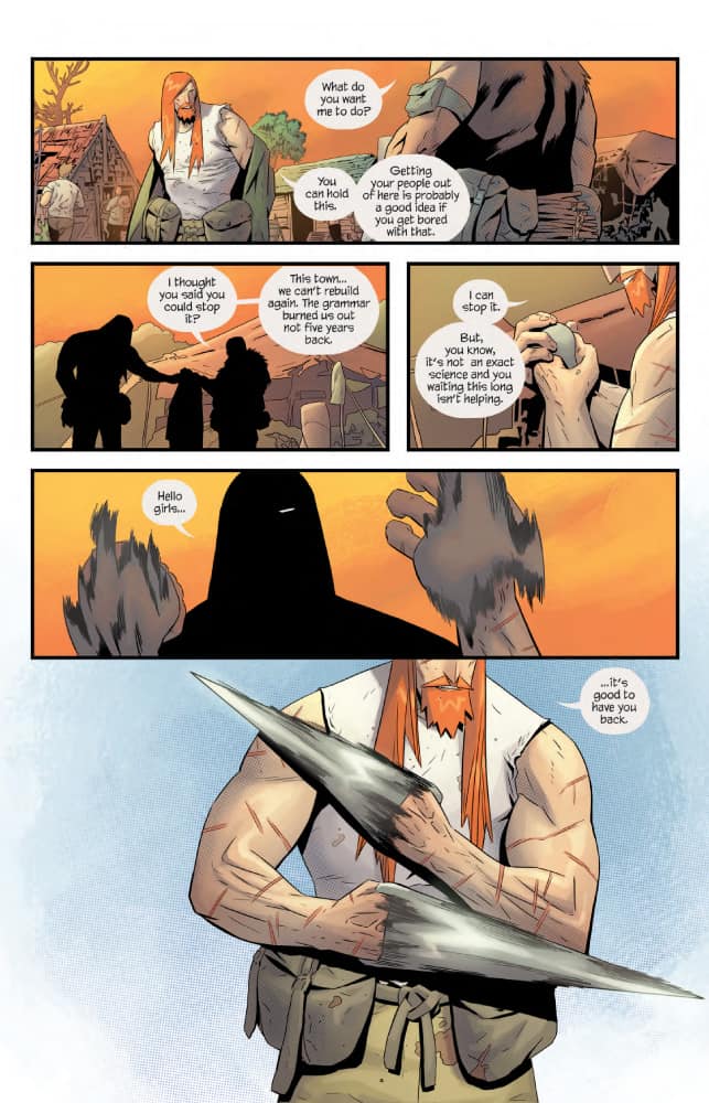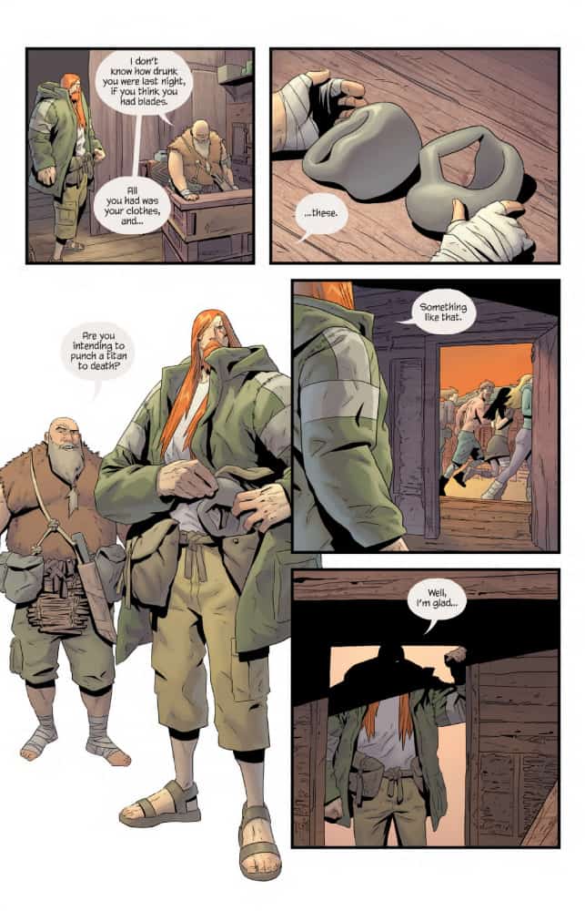 Here enters Strayer, the mercenary who lives for taking down Titans, as long as it comes with a fee of course. But he’s not your normal barbarian that is usually found in these parts. He carries a very odd pair of knuckle bands that form large blades and he also seems to have the power of invulnerability. Good tools to have in the land of monsters, as it is shown in the first issue. Strayer is tossed in jail for fighting but it’s not long before the town needs his help, but he must be careful. As it is not easy taking down a titan and not end up flattening the village in the same process.
